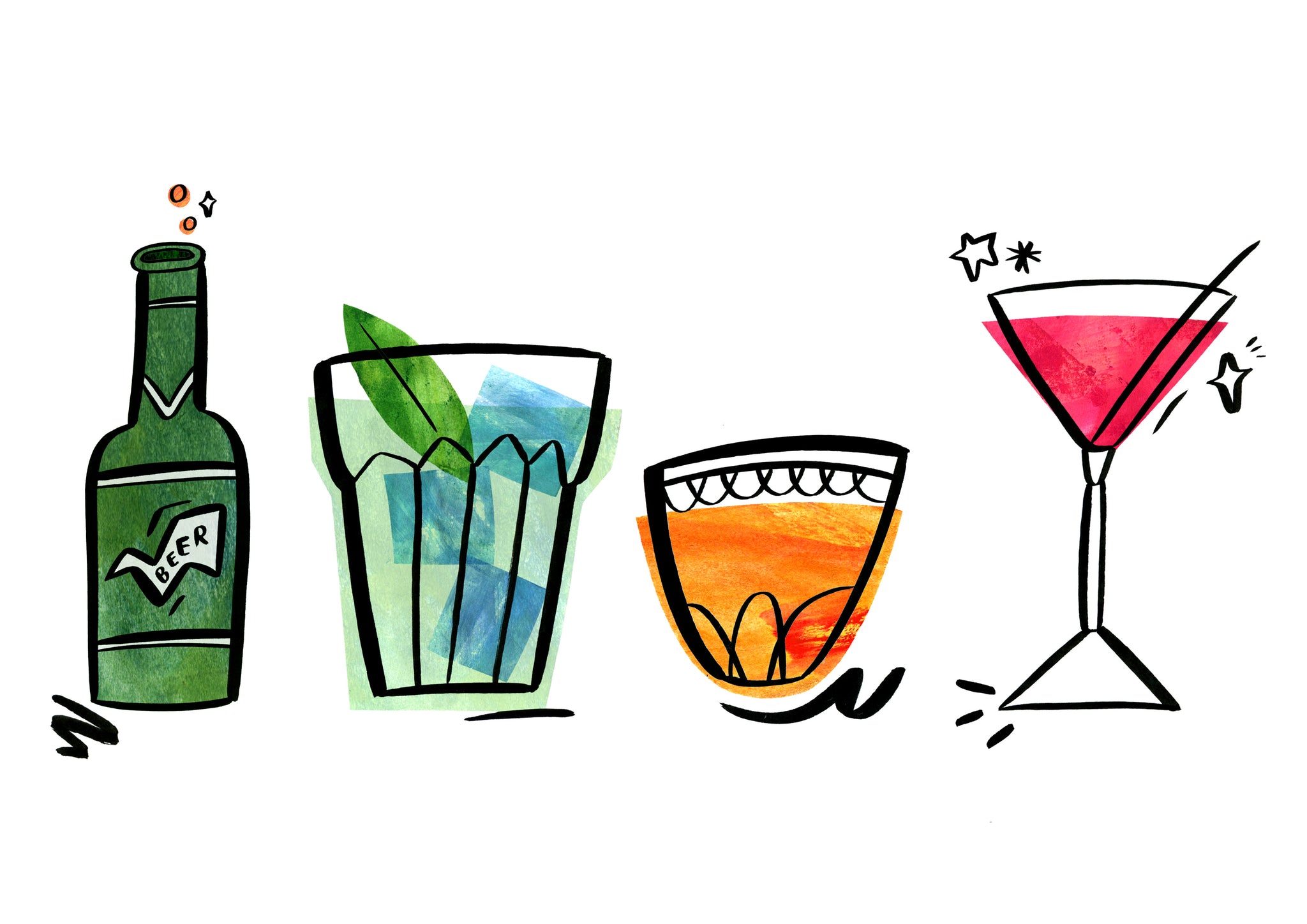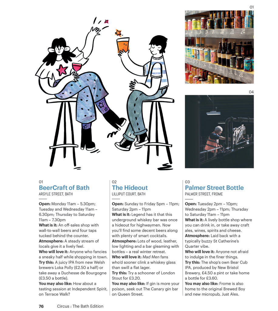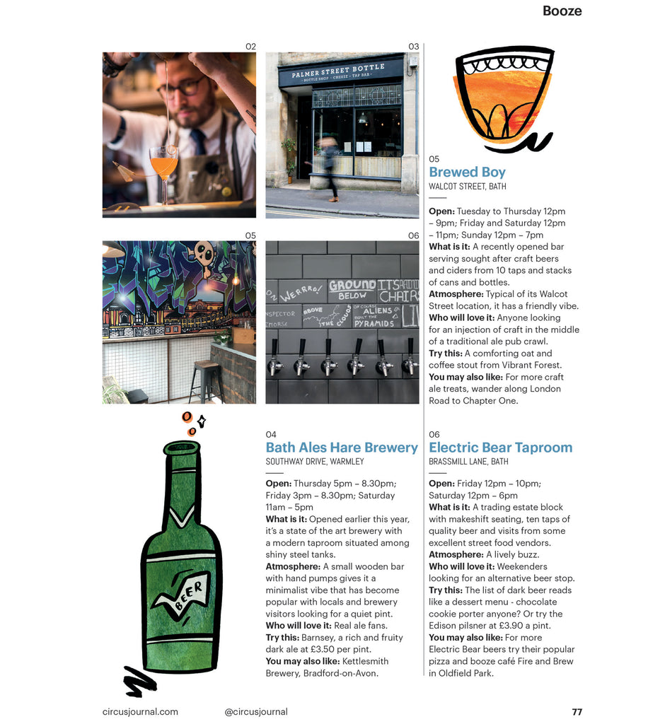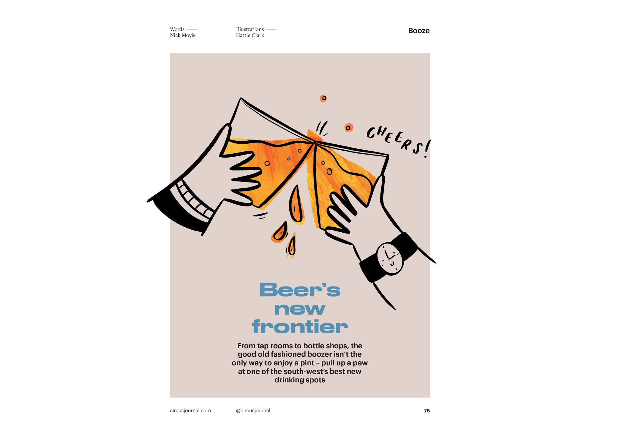 I illustrated boozy illustrations for Bath-based Circus Magazine. I incorporated hand-made textures with loose inky lines to sit alongside the article.