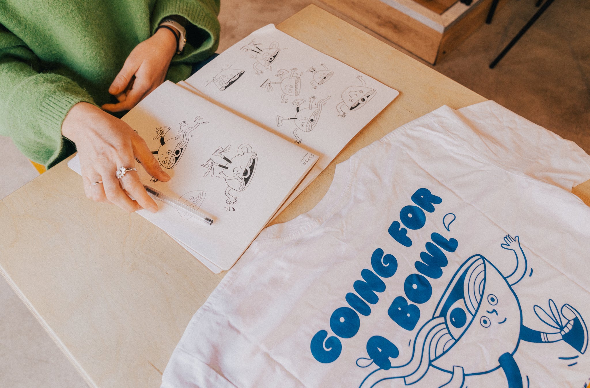 I focused on creating tasty characters inspired by the ingredients and dishes served. I used the illustrations alongside punchy text and playful wording for bold t-shirt designs.